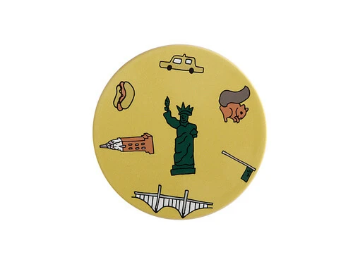 - Depicts iconic symbols of New York City such as a yellow taxi, a hot dog and a squirrel